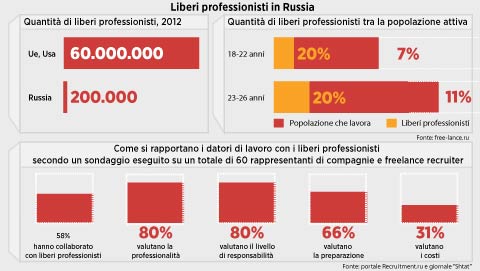 I liberi professionistiin Russiasono meno amatiche in Occidente. Secondo gli esperti, il numero deifreelancer nelle società russe cresce molto più lentamente che nel resto del mondo. Negli ultimi dueanni, il numerodei datori di lavoro russiche hanno concesso ai loro dipendenti di lavorare "da casa"è aumentato solo deldue per cento.Ciononostante, sono comparsi nuovi settori in cui la figura del libero professionista è sempre più richiesta.