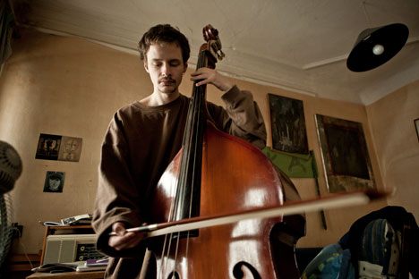 Lesha nella sua casa, mentre suona il contrabasso e compone musica (Foto: Kirill Lagutko)
