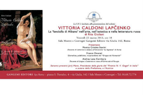 Sulle tracce di Vittoria Caldoni, alla scoperta di come la sua bellezza influenzò l’arte russa. Il 22 marzo 2013 alle 18, presso la Sala Mostre e Convegni Gangemi Editore a Roma (Via Giulia, 42), Rita Giuliani, professoressa di Lingua e Letteratura russa all'università "La Sapienza", autrice di monografie e saggi sulla letteratura russa dell'800 e '900, presenterà il suo nuovo volume “Vittoria Caldoni Lapcenko, la 'fanciulla di Albano' nell'arte, nell'estetica e nella letteratura russa” (Gangemi Editore).