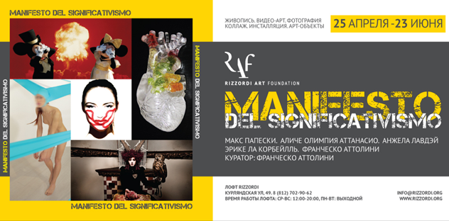 "Ovunque mondo, ovunque arte". Viene presentata così, con questo inno all'arte, la performance artistica Made in Italy che dal 25 aprile al 23 giugno 2013 farà tappa a San Pietroburgo, nella Rizzordi Foundation (Kurland Street, 49). Cinque artisti italiani, le cui creazioni sono state esposte nei musei di tutto il mondo, daranno vita al "Manifesto del Significativismo": una mostra-evento che si propone di creare un nuovo format di esposizione-laboratorio, dove le persone diventano attori di una grande e unica performance.