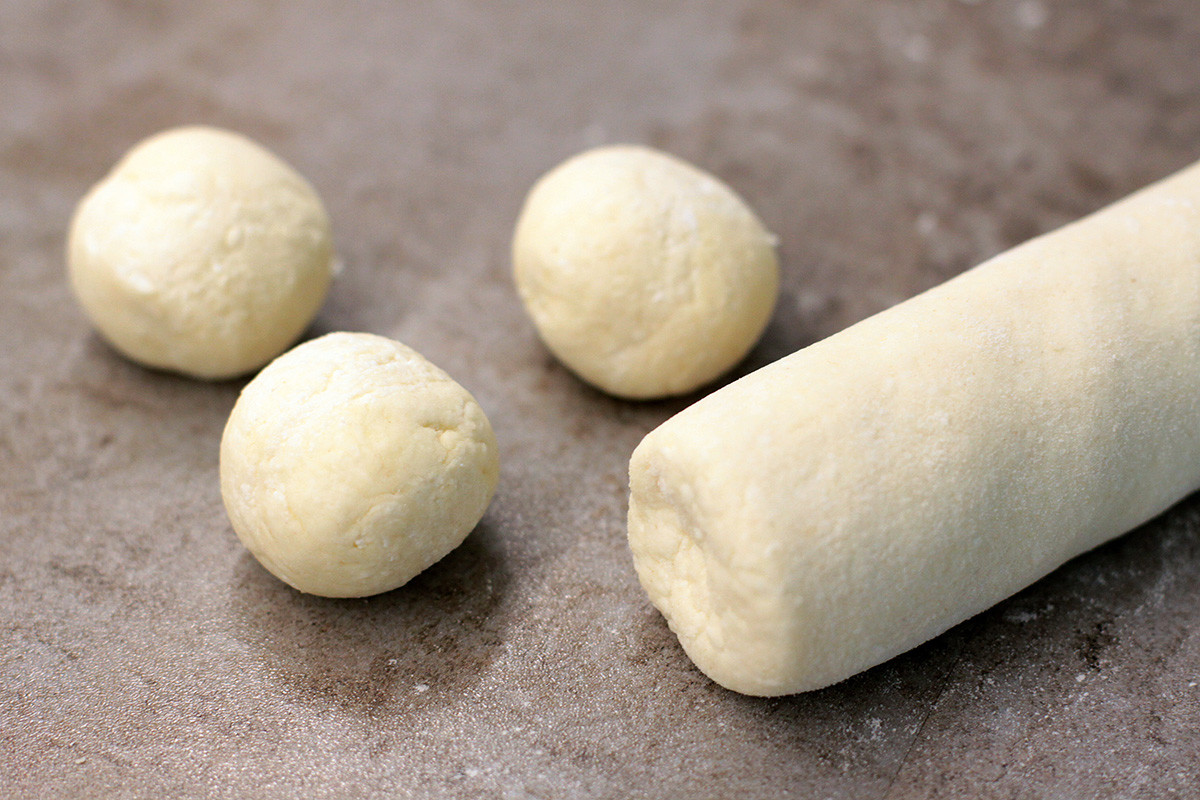 Con la pasta formate un lungo cilindro di circa 3-4 cm di diametro e ricavatene dei pezzi rotondi di uguali dimensioni.