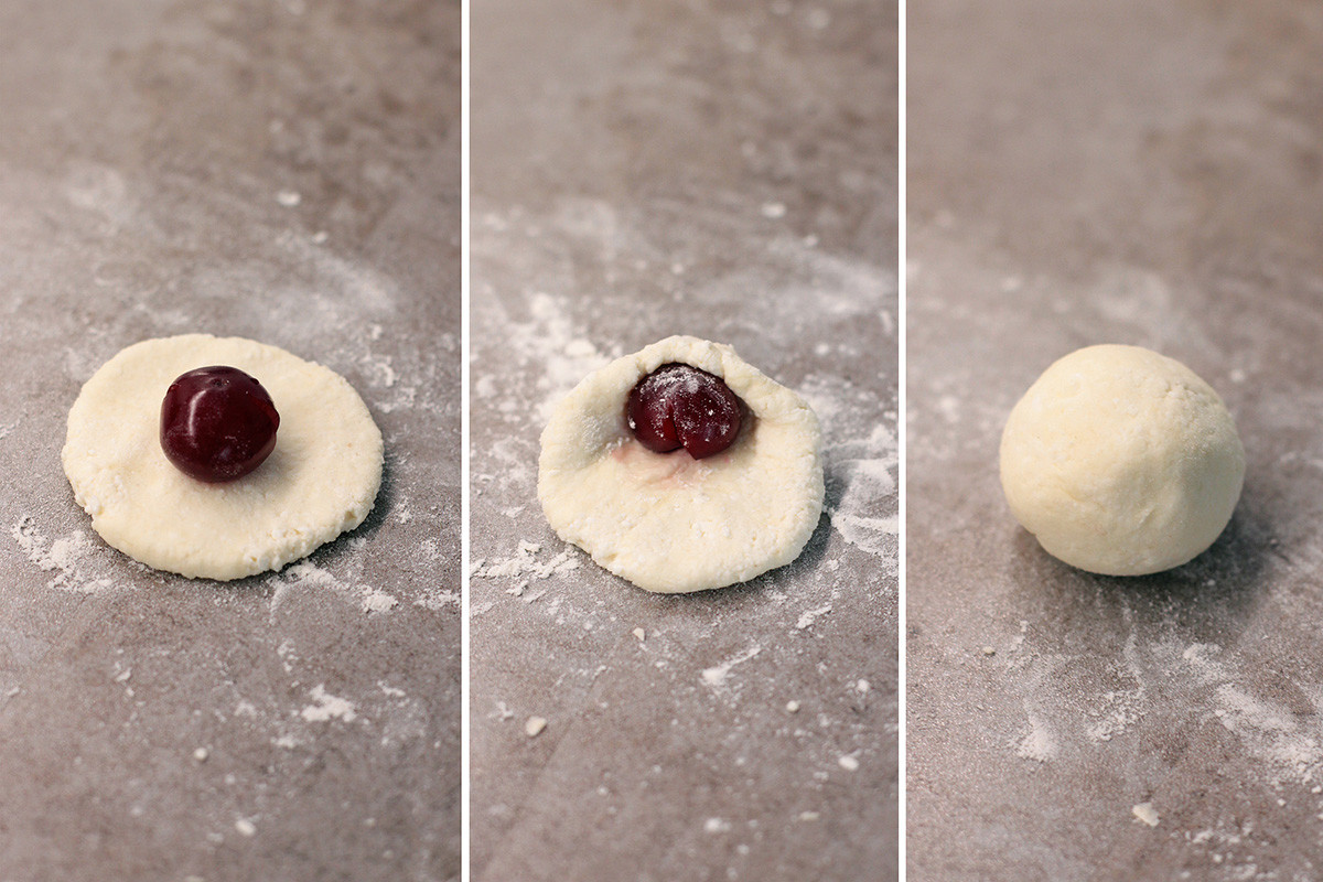 Spolverate il piano di cottura con la farina e lavorate un pezzo di impasto alla volta, formando dei dischi sottili all’interno dei quali sistemerete una ciliegia. Chiudete delicatamente i bordi e formate una pallina. Ripetete l’operazione con i pezzi rimanenti dell’impasto.