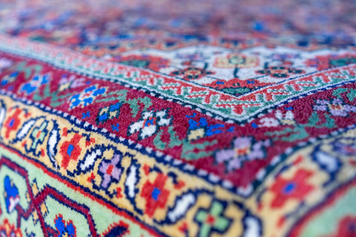La tappezzeria originale non esiste più, ma gli artigiani iraniani hanno creato un nuovo tappeto, ispirandosi alle antiche tradizioni persiane. Per realizzarlo si sono avvalsi dell’annodatura (circa 160 mila nodi per ogni metro quadrato) di fili di lana di pecora con l’aggiunta di lana di cammello. Per la tintura, inoltre, sono stati usati dei coloranti naturali tra cui corteccia di rovere e di alberi da frutta, foglie di limone ed estratto di datteri. Ciò ha consentito di ottenere un risultato fedele al modello originale!