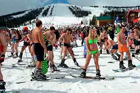 Alla discesa in costume da bagno sui pendii della stazione sciistica di Sheregesh hanno partecipato in 700, superando il precedente record di 250 persone registrato in Canada (Foto: Aleksandr Kryazhev / RIA Novosti)