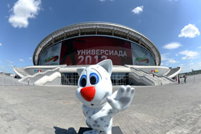La mascotte delle Universiade 2013, il leopardo delle nevi, davanti all'ingresso principale dello stadio "Kazan Arena" a Kazan. Le Universiadi si svolgeranno a Kazan dal 6 al 17 luglio 2013 (Foto: Vladimir Pesnya/ RIA Novosti)