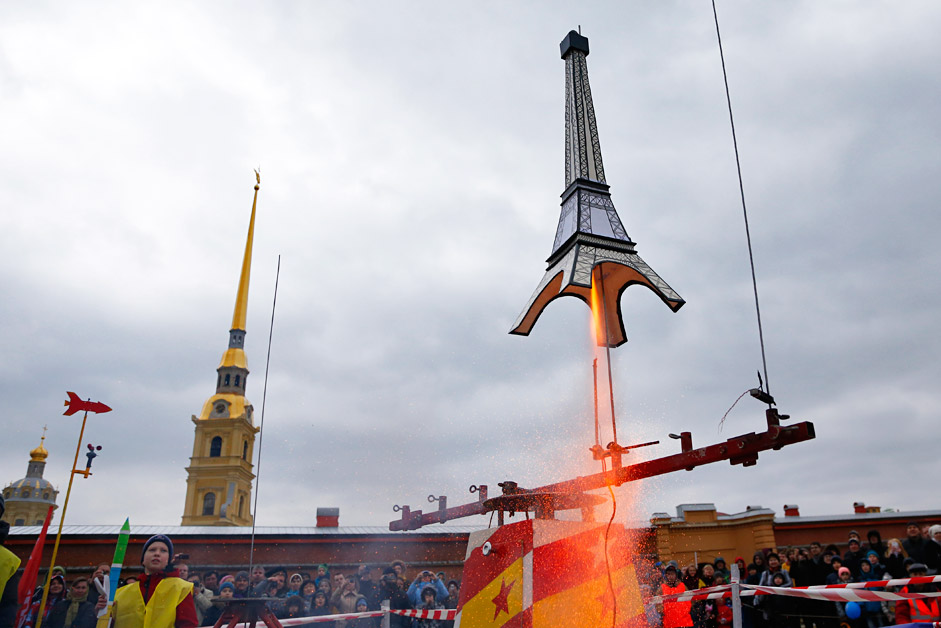 Per celebrare il 53esimo anniversario del primo volo dell'uomo nello spazio, a San Pietroburgo è stato costruito un razzo dalla forma particolare (Foto: AP)