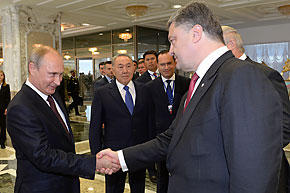 Il presidente russo Vladimir Putin e quello ucraino Petro Poroshenko si sono incontrati a Minsk per il vertice tra Unione doganale (Russia-Bielorussia-Kazakhstan), Ue e Ucraina. Durante il faccia a faccia - il secondo tra i due, dopo quello del 6 giugno in Normandia per i 70 anni dello sbarco - Putin ha dichiarato che la crisi ucraina non può essere risolta attraverso un’ulteriore escalation di forza (Foto: AP Photo/Kazakh Presidential Press Service, Sergei Bondarenko, Pool)