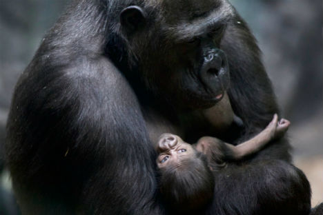 Il cucciolo di gorilla, nato nello zoo di Mosca, si fa coccolare tra le braccia della mamma (Foto: AP)