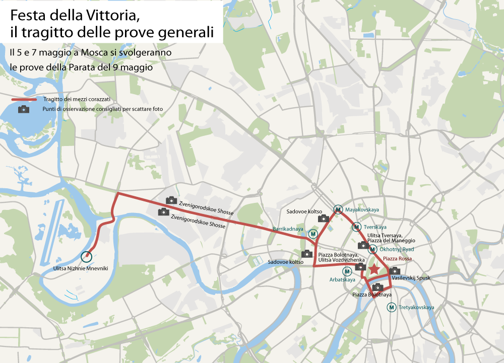 Il 5 e 7 maggio a Mosca si svolgeranno le prove della Parata delle Vittoria. Ecco il tragitto dei mezzi corazzati e i punti di osservazione consigliati per scattare foto