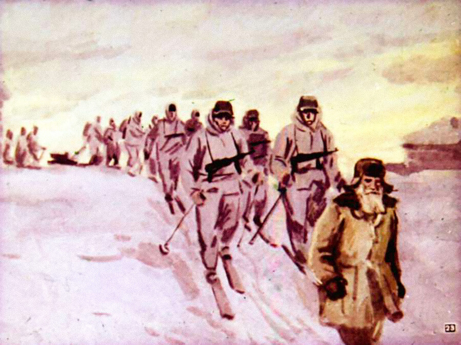 A. Samsonov/Diafilm, 1971Quando nell’estate del 1941 nel villaggio entrarono i tedeschi, il vecchio decise di restare; non aveva abbastanza forze per evacuare. Nel febbraio del 1942, l’ottantatreenne Kuzmin fu convocato dal comandane del battaglione tedesco che gli propose un affare: Kuzmin doveva condurre i tedeschi alle postazioni sovietiche vicino al villaggio di Pershino, in cambio avrebbe ricevuto dai tedeschi della farina, del cherosene e un fucile da caccia. Un testimone, intervistato nel 1965 dal giornale “Velikolukskaja pravda”, riferì che si trattava di un gruppo di tedeschi di circa 35 persone che costituivano l’avanguardia di un battaglione di alpini sciatori. Il loro compito era quello di eliminare i militari nei posti di blocco per cogliere poi di sorpresa le truppe sovietiche.